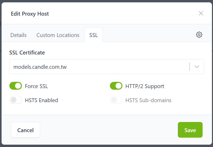 另一個 oa.candle.com.tw 是跑在舊的 Apache 上,而且 Apache 本身已經設定好 SSL (Port 443)。當我用 NPM 指向它時,瀏覽器報錯:Misdirected Request。