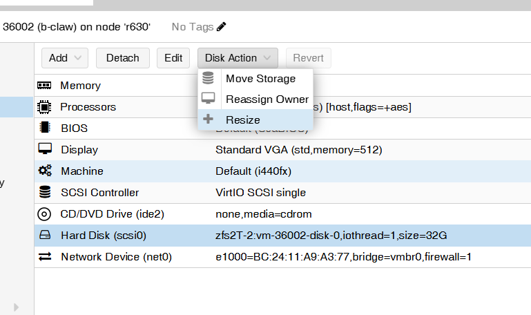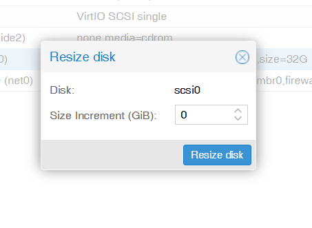 先增加硬碟空間: 在 Proxmox 頁面,點 vm, hardware, Disk Action, 選 Resize: