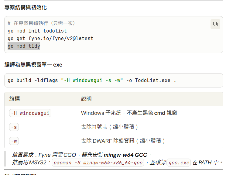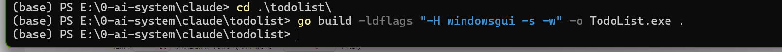 go build -ldflags “-H windowsgui -s -w” -o TodoList.exe .