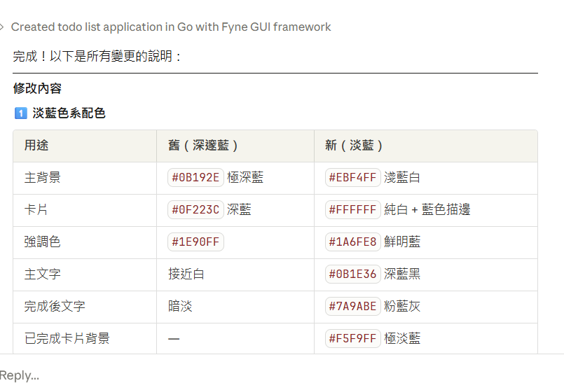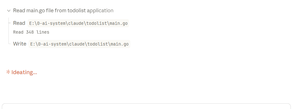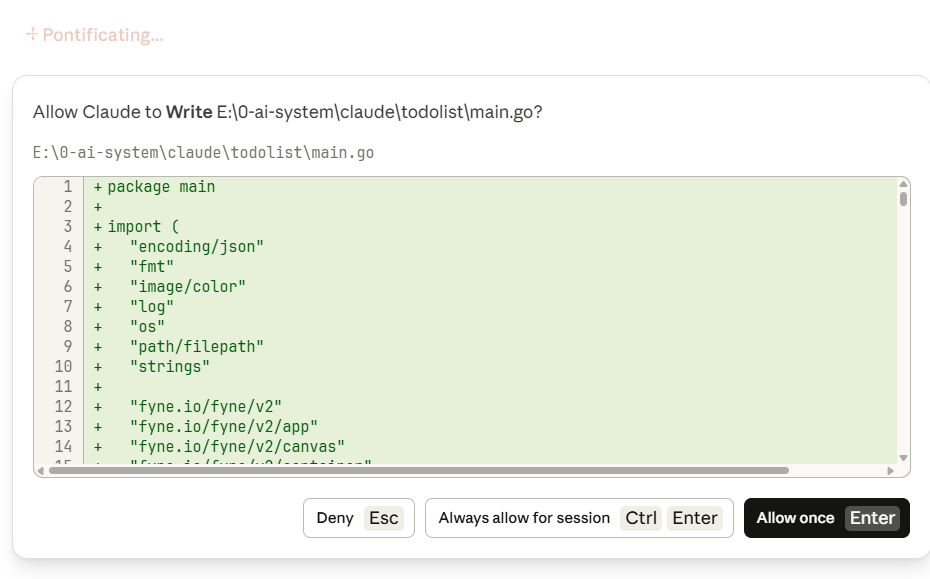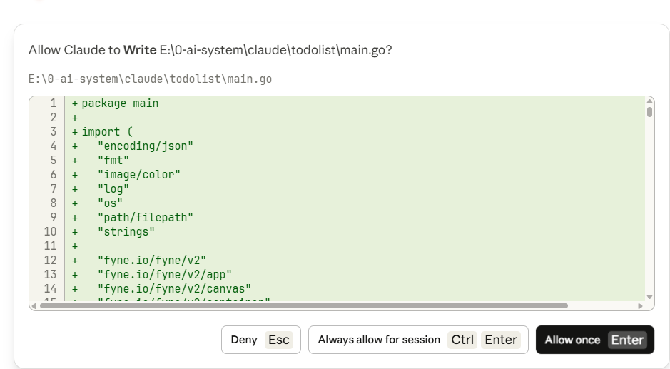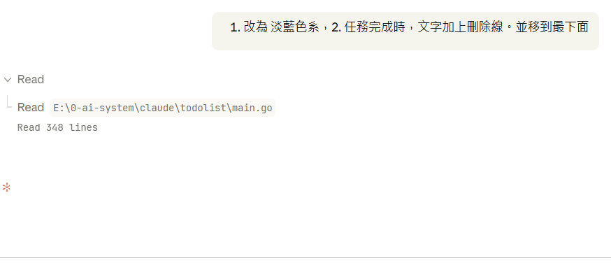 「列出目前目錄下的檔案,並幫我把剛才的 TODO App 程式碼直接寫入 main.go。」
